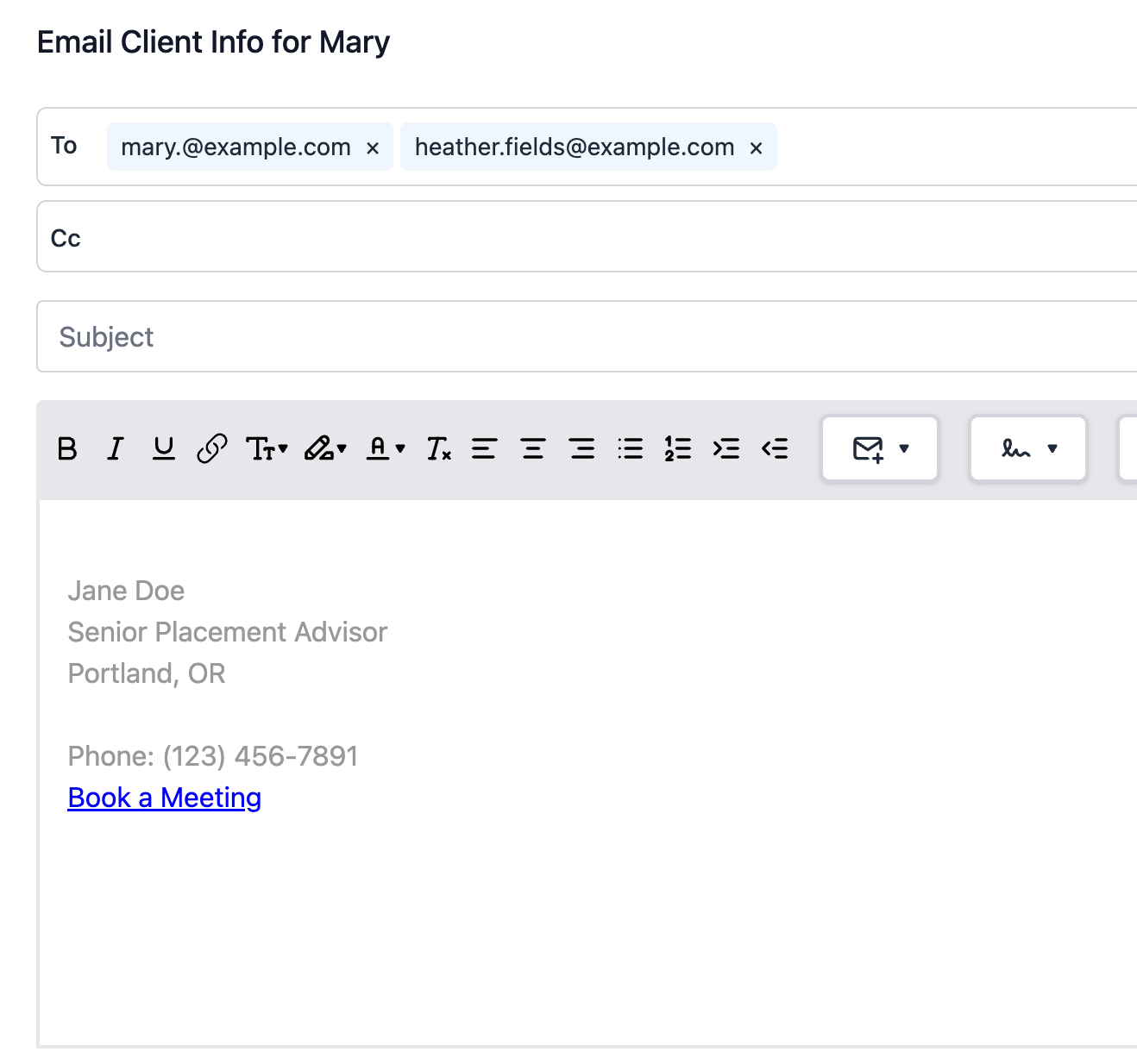 - Create your Signature - If you have existing formatting for the signature you use in Gmail, Outlook, or another platform, the best way to keep the same formatting is to copy/paste the entire signature block from that platform into Senior Place. In the example above, everything we copied, retained the formatting from Gmail.