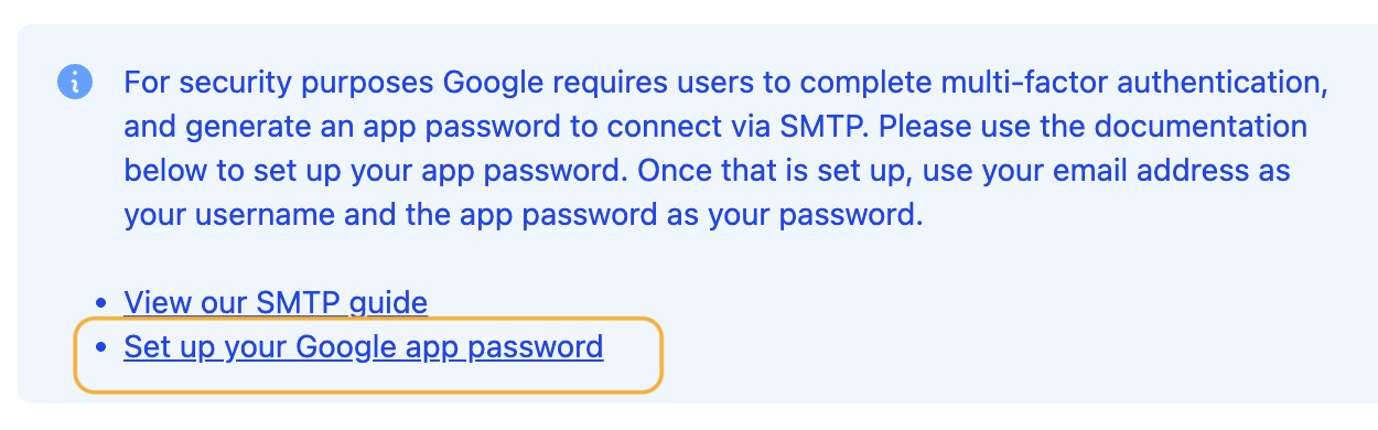 If 2FA is not enabled, clicking the Google App Passwords link will redirect you to an error page. See below for instructions on how to enable 2FA for your Gmail account.