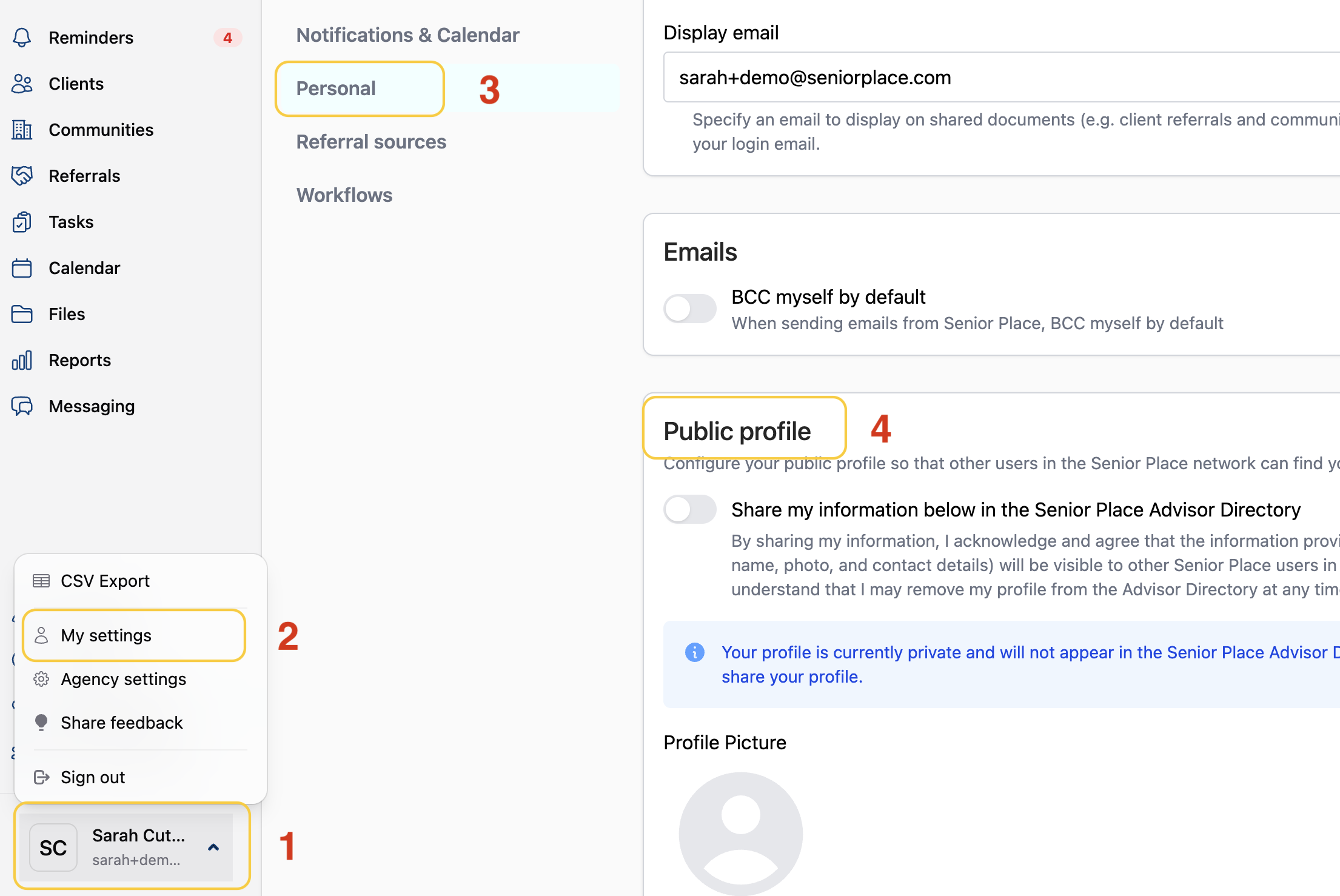 Note: Each advisor must complete their own profile in their settings. This customization cannot be done for each user at an administrative level.