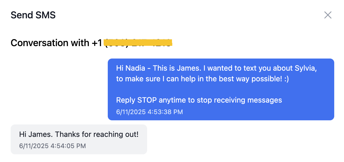Note: A sentence will be added to the end of your first text (as seen in the screenshots below) to remain in compliance with texting regulations.
