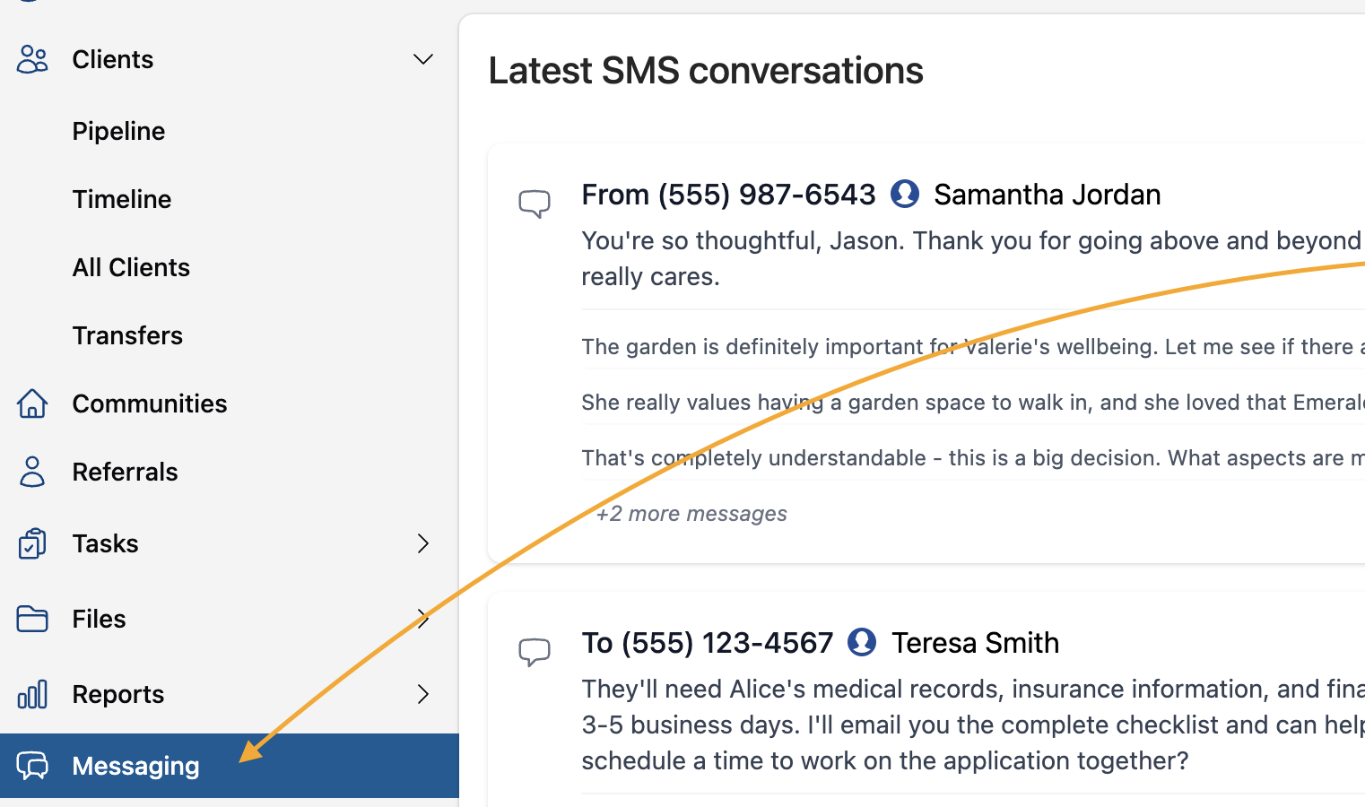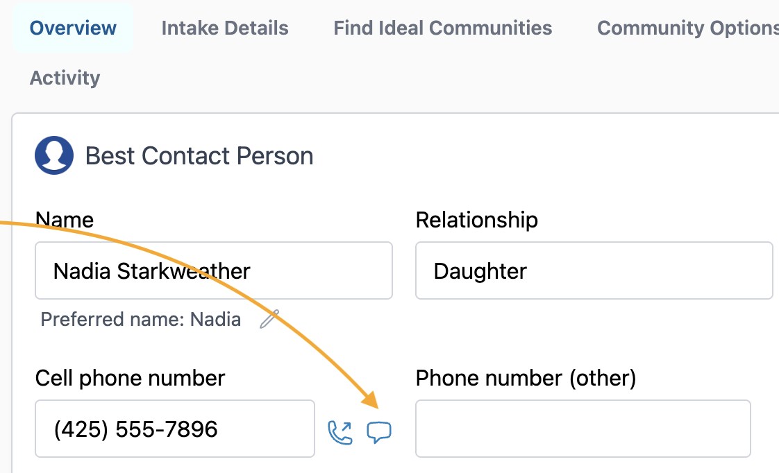Upon navigating to a Client, Community, or Referral profile, scroll to the Phone Number and click the message 💬 icon.