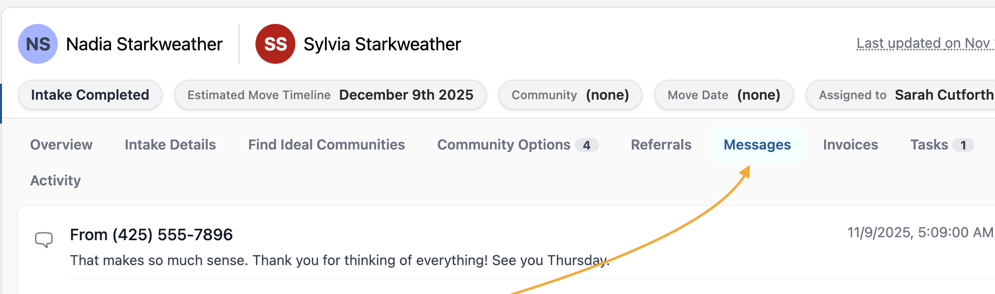 Within the Messages tab of the relevant contact, you'll find your texting threads.