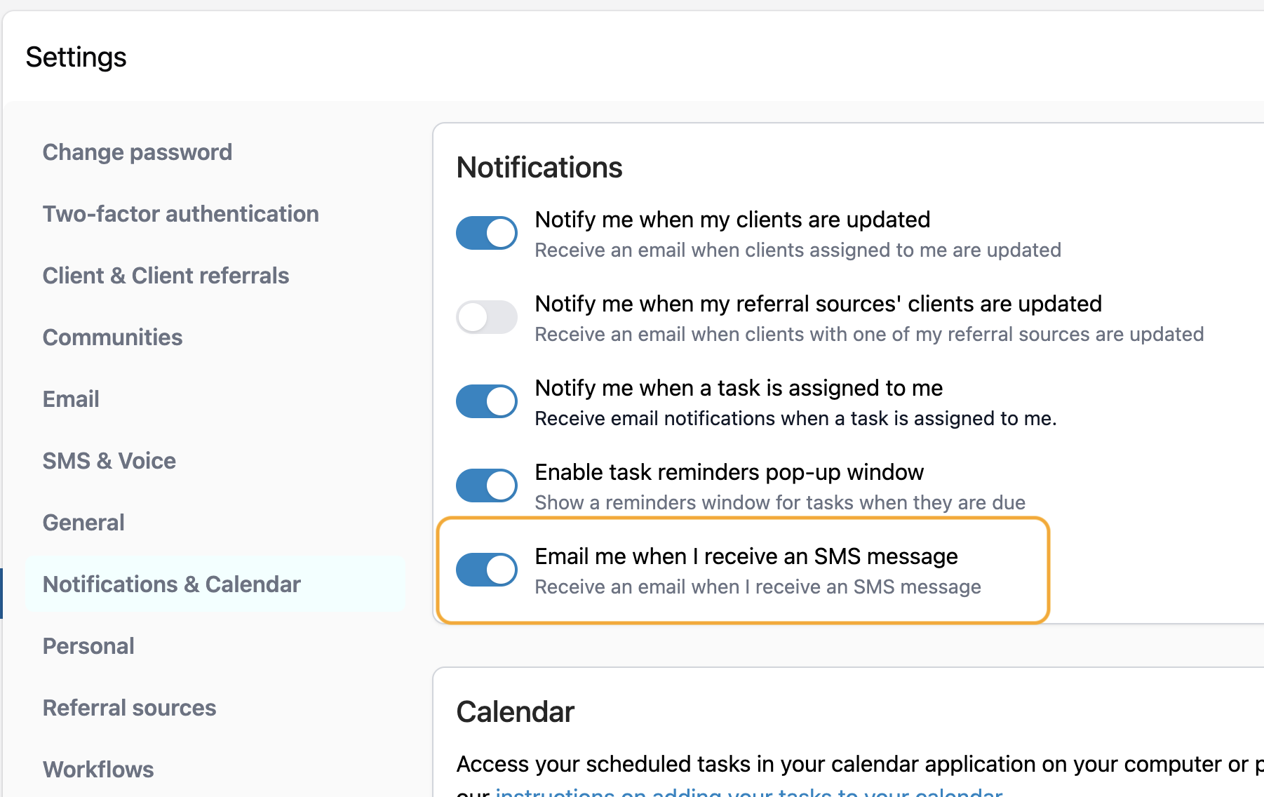 If you want to receive email notifications about new texts, ensure the "Email me when I receive an SMS message" setting is checked within My settings > Notifications & Calendar.