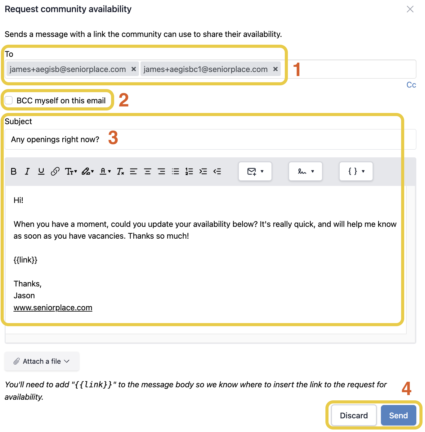After clicking Request Availability (whether you chose to do so in step 1A, 1B, or 1C), proceed by customizing and sending the availability request email to the relevant community contacts:
