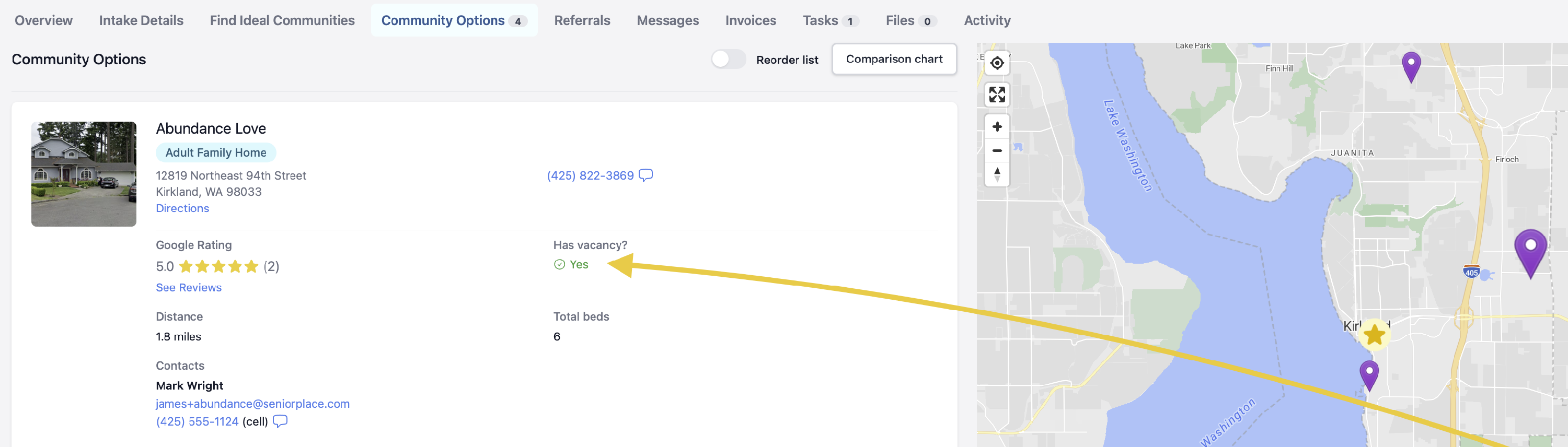 Within the Community Options tab of a client profile, search for the Has vacancy? section on the community cards. In that section, you'll notice either a Yes or No, depending on what information the community provided. To see further details, navigate to the Community's Insights tab.