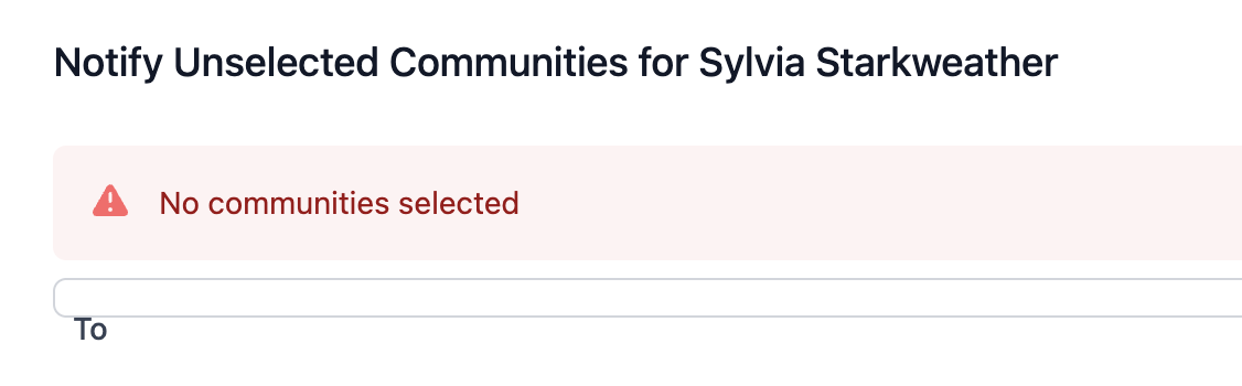 If a chosen community has been selected but no referrals have been sent out, when you navigate to the Actions > Notify Communities option, the email builder will pop up, but no community emails will be included.
