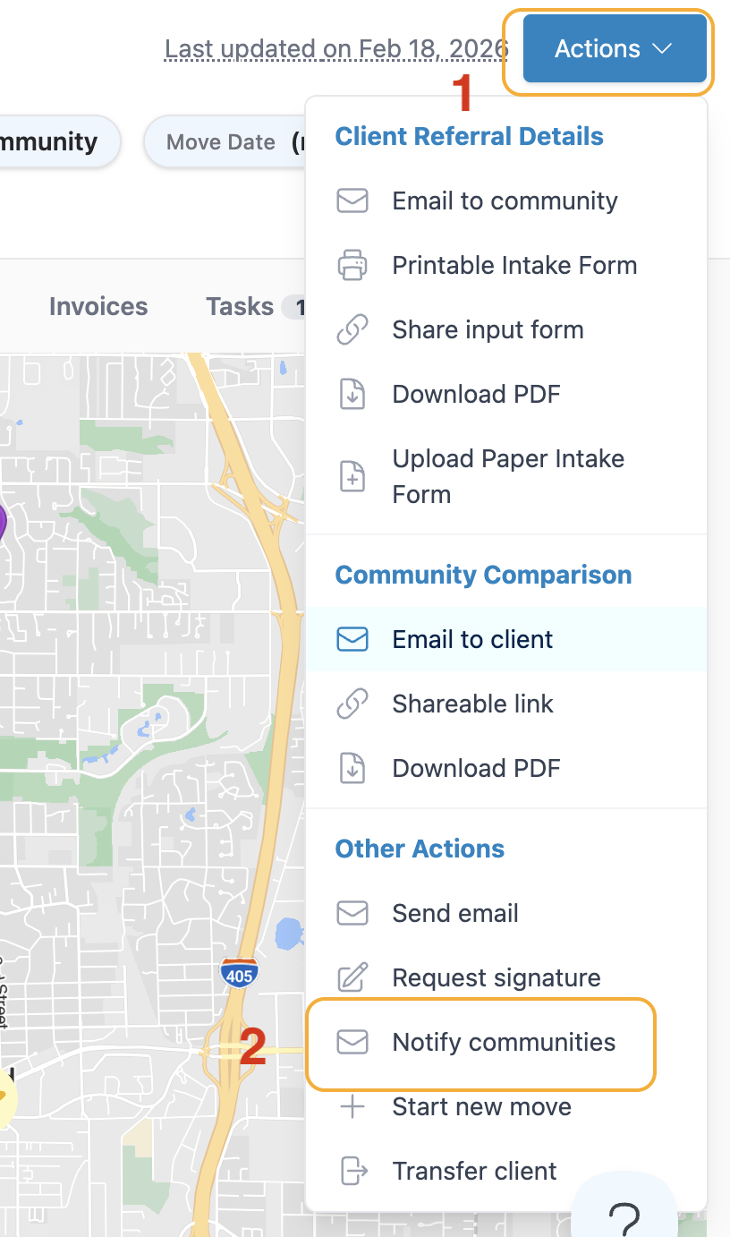 Before you can utilize the Notify Communities feature, a referral must have been sent to the client's community options, and a chosen community must be selected.