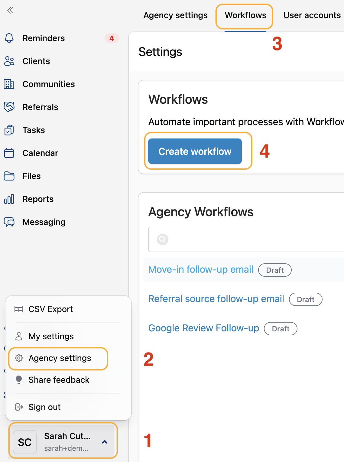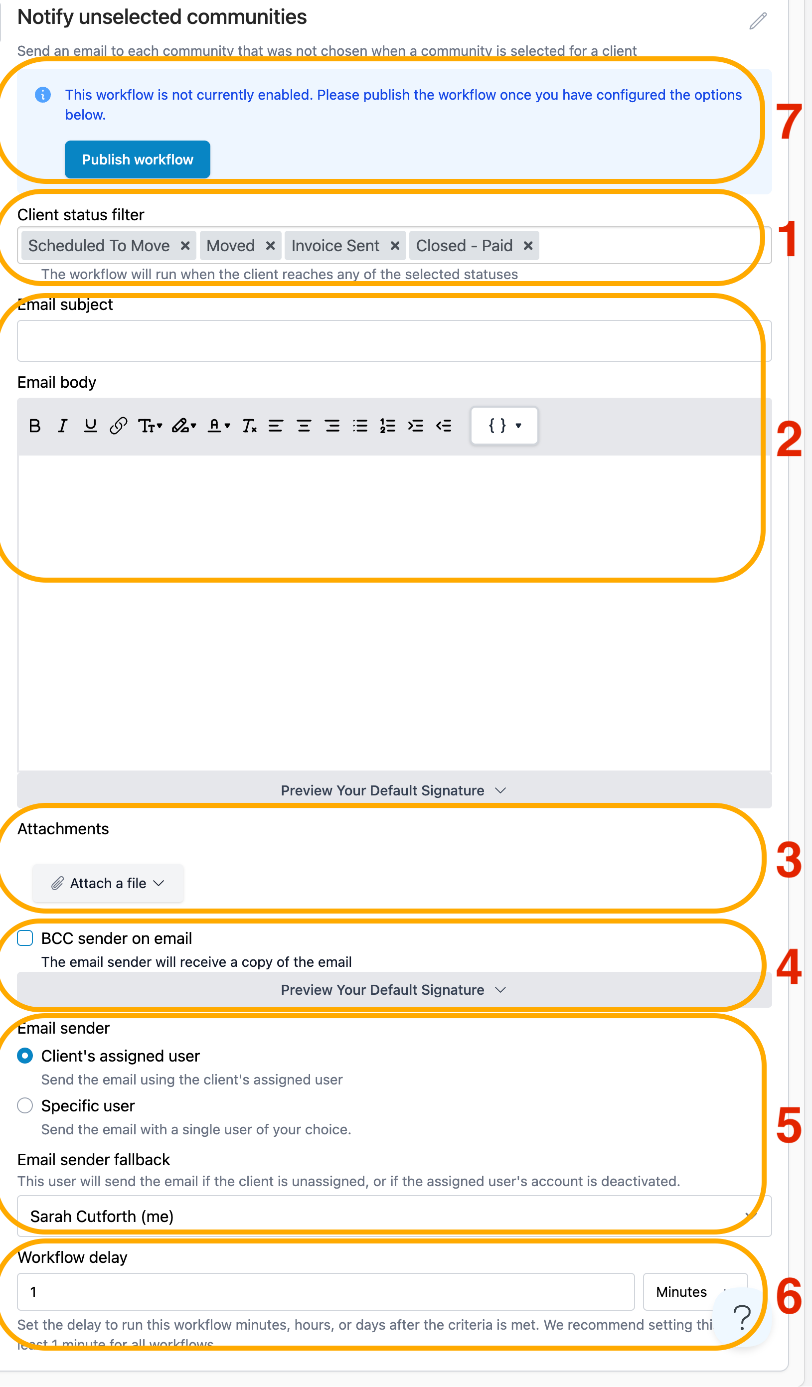 - Client's assigned user - The workflow will automatically send from whoever the client is Assigned to. Please note that you'll need to set the Email sender fallback for any Unassigned clients.