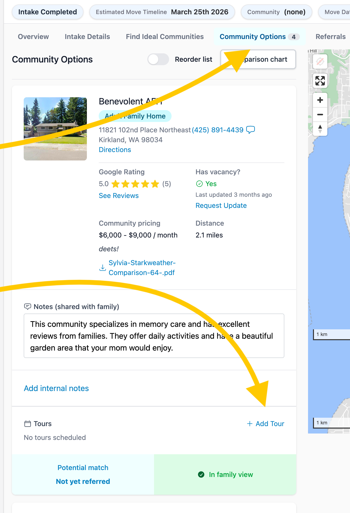 When a tour is scheduled for a client, you may want to track this tour information directly in their client profile and be able to view your upcoming tours on your Senior Place calendar. Here’s how you are able to do this: