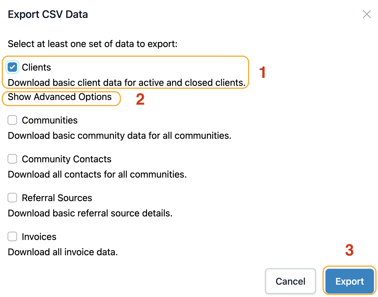 - Choose what data you'd like to export (Client, Community, etc.)