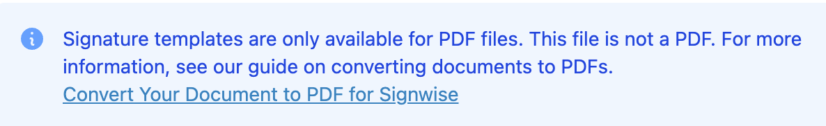 2. Choose the Signature template option. If your file is not a PDF, a popup will appear (see below) prompting you to convert your file to a PDF before you can complete setting up your SignWise template.