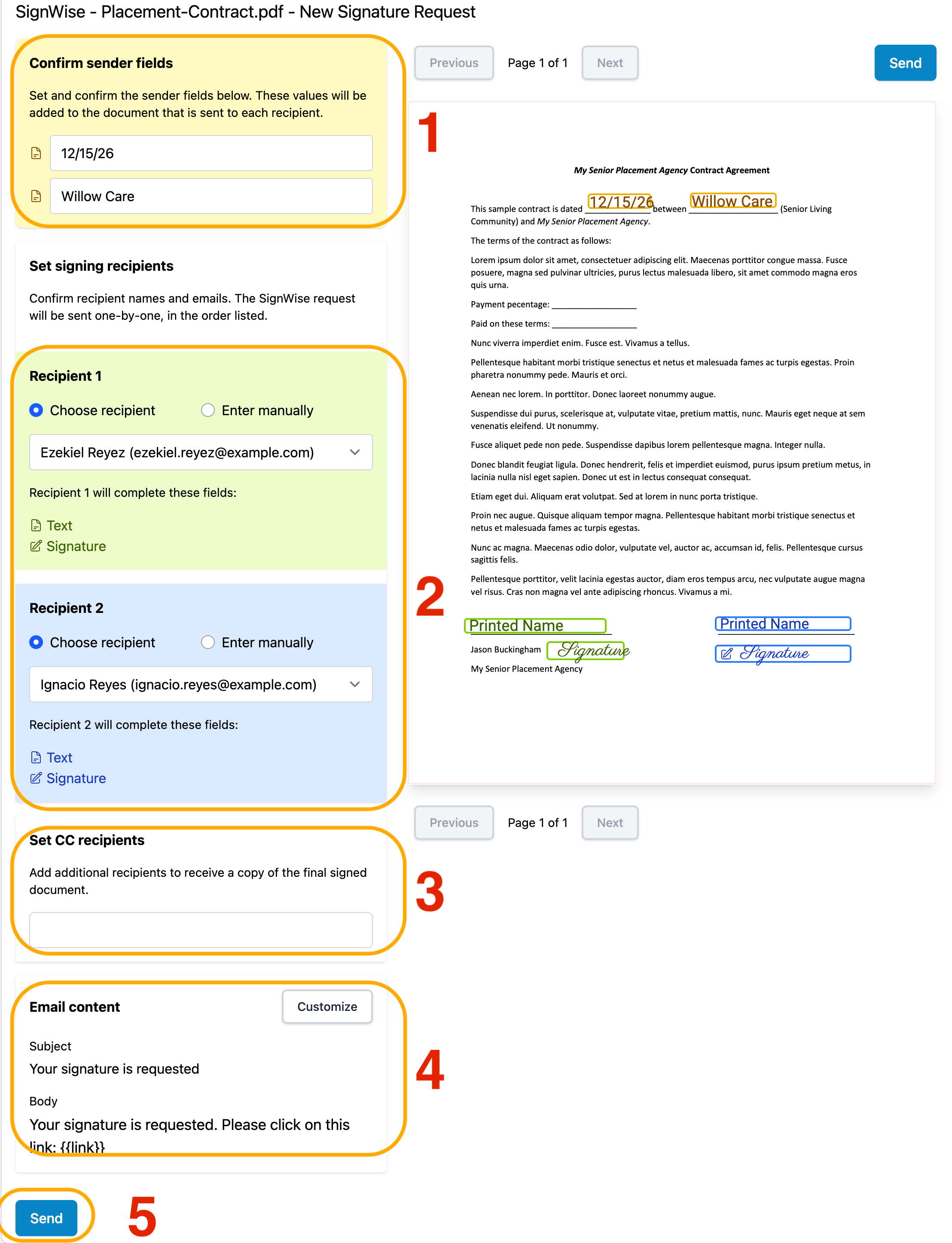 1. Fields for additional recipients will match the setting color on the left. In this example, Recipient 2 fields are blue.