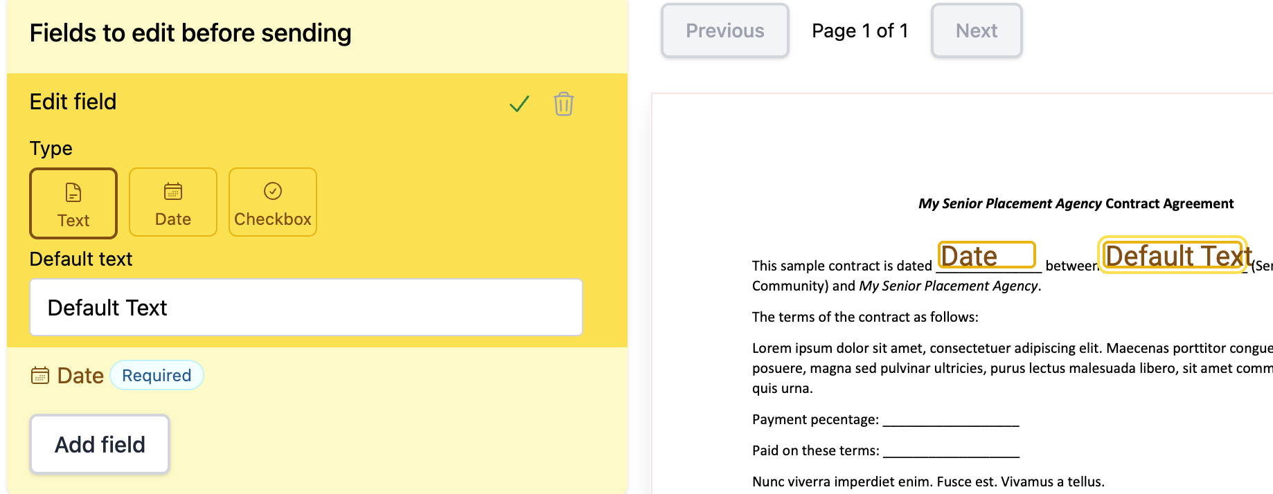 These fields will be filled out by you or your team before the template gets sent to a recipient. You can add Text, Date, and Checkbox fields. Simply click Add Field, and drag it the location you want. You can also resize the field as needed. Additionally, if the field will typically be the same text, you can add Default text to reduce manual entry when sending the document. That text can be edited if needed before the document gets sent out.