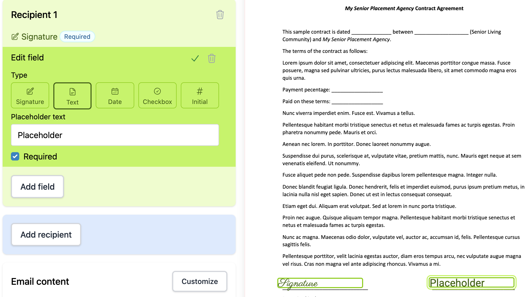 You can add Signature, Text, Date, Checkbox, and Initial fields for recipients. Simply click Add Field, and drag it the location you want. You can also resize the field as needed. Additionally, if you want to have Placeholder text (explaining what the signer should add), you can define that placeholder when creating the field. You are also able to indicate if a field is required to be filled out by the recipient.