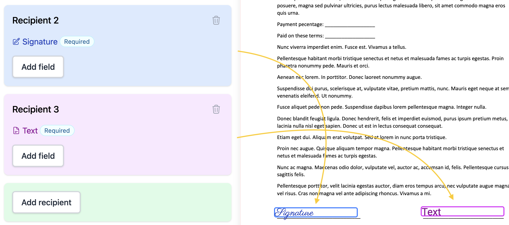 Fields for additional recipients will match the setting color on the left. In this example, recipient 2 fields are blue and recipient 3 fields are purple. If you require more than one recipient, simply click Add recipient, and add the fields for that individual.