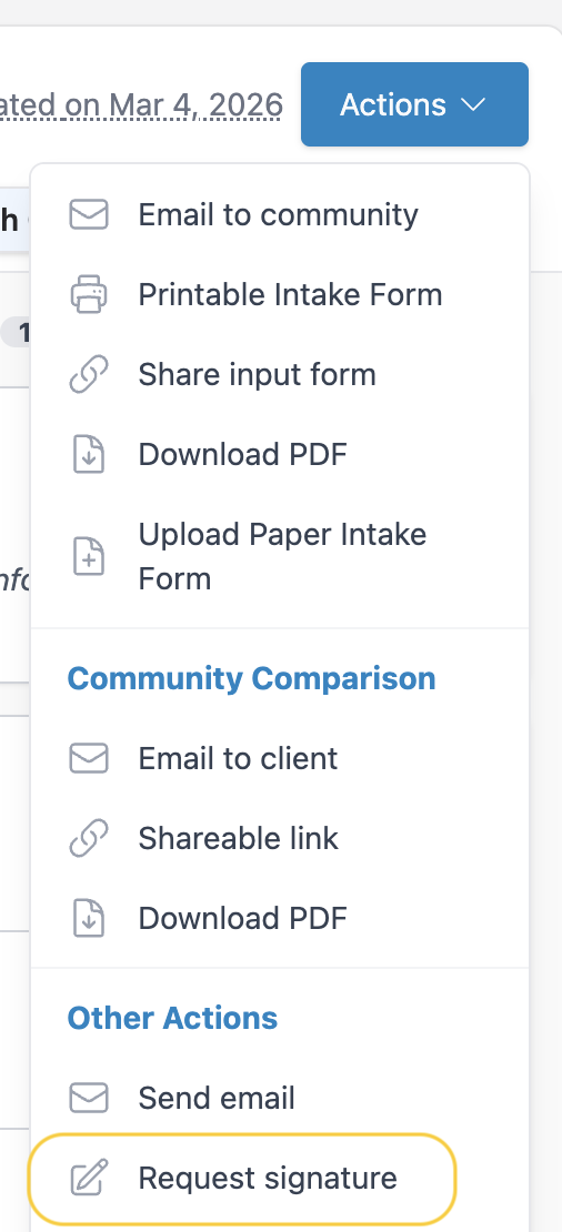 From within a client, community, or referral source profile, click Actions and choose Request Signature.