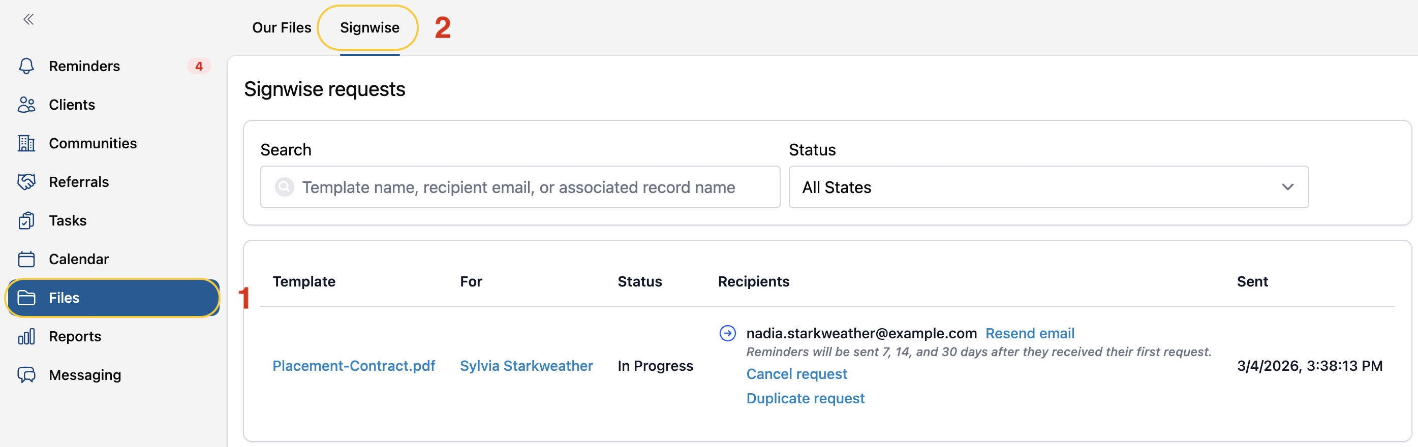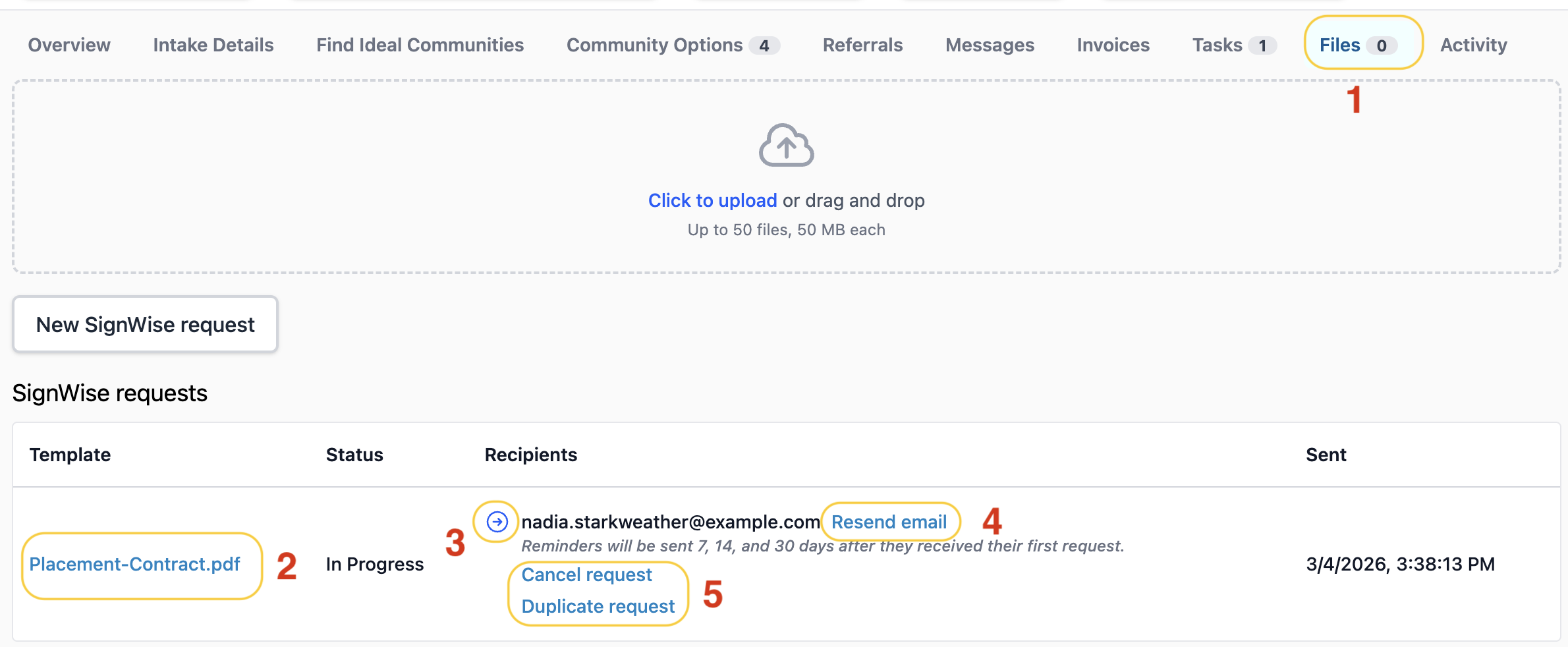 While the signing process is mostly out of your hands at this point, you can still monitor the progress of your requests and make adjustments as needed. Not only will the SignWise request email show on the Messages tab of the related profile, but you'll also be able to see the requests details on the Files tab as well: