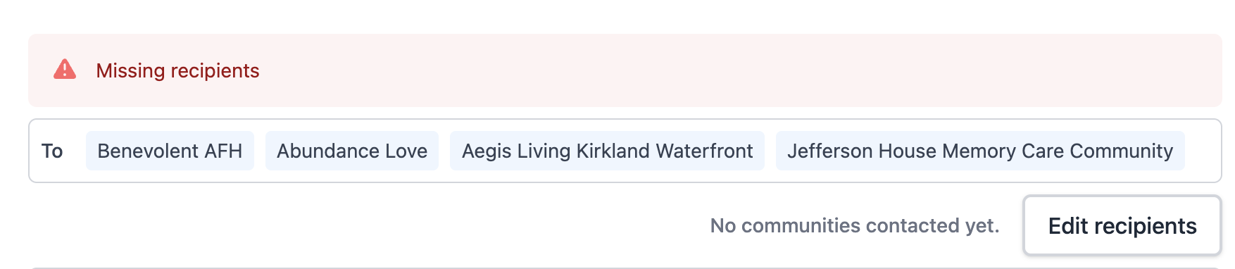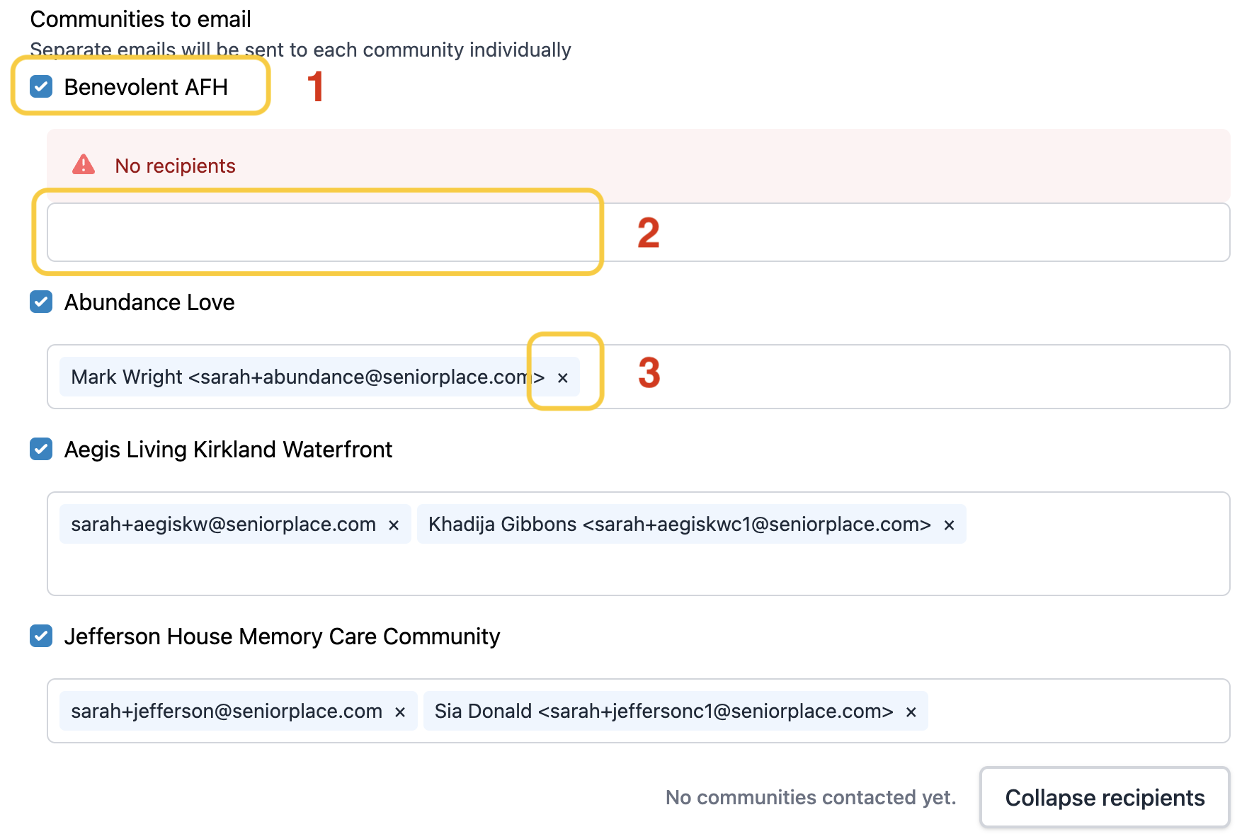All primary contact email addresses will automatically populate in the community recipients lists. If there are no primary contact email addresses associated with a community, an error message will display: