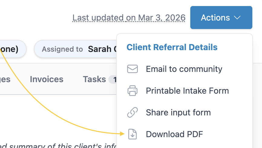 - To preview the Client Intake PDF, go to the clients Actions tab and choose Download PDF (see image below).