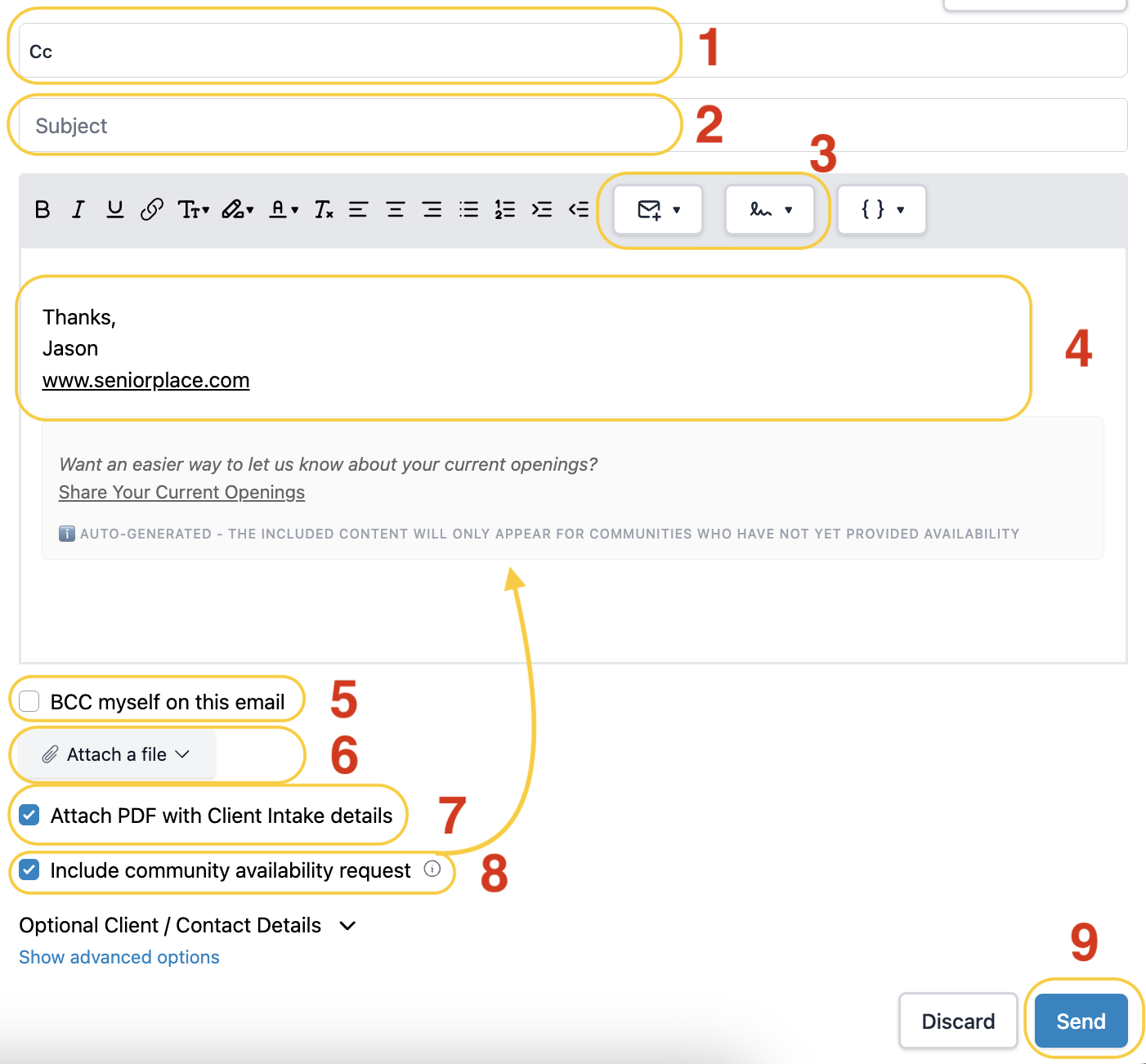Once you've ensured the recipients list is accurate, you can edit and send your referral email. See below for more details: