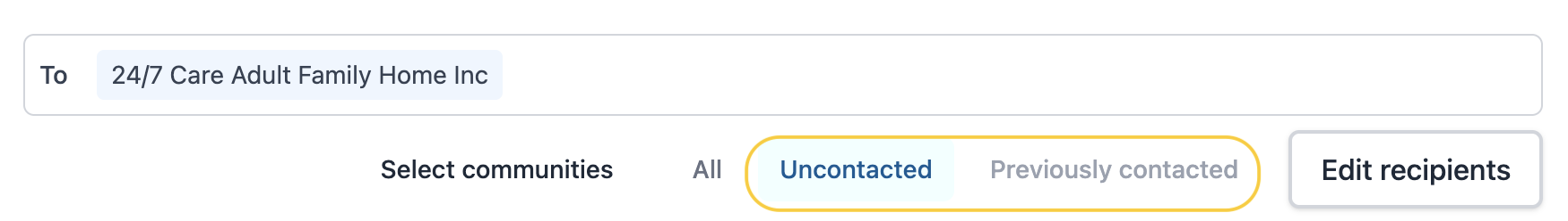 - If you’ve already sent a referral to your client’s initial options but later add more, you can easily update the referral recipients. To send to the new options only, select Uncontacted. To reach only the communities you’ve already contacted, select Previously Contacted. (see image below)