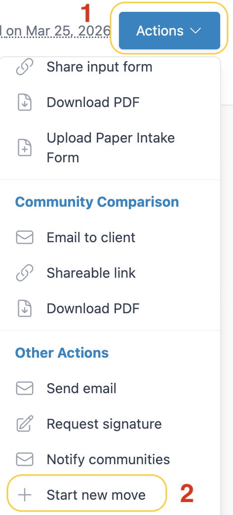 - From within the client profile for whom you'd like to create a new move for click Actions