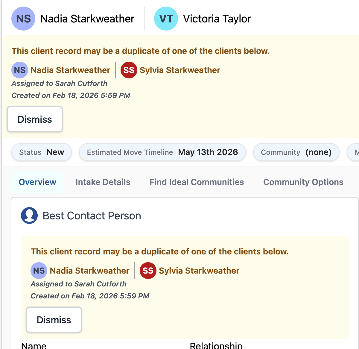 Whether you're working solo or with a team, it can be easy to mistakenly add a duplicate client. That's why Senior Place automatically detects when a client name or best contact name is similar to another client you've already created.