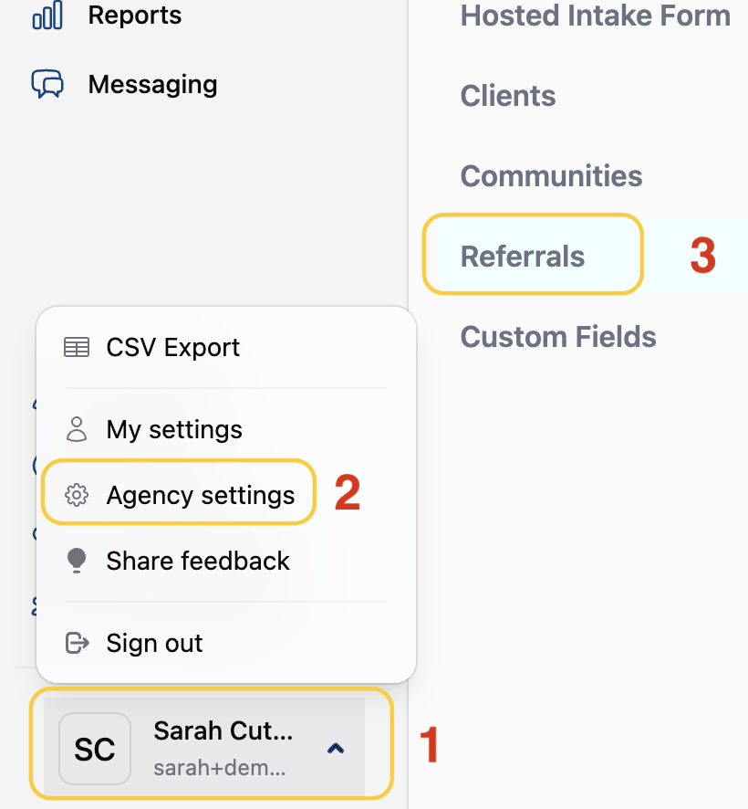 1) Navigate to the Referrals > Agency Setting