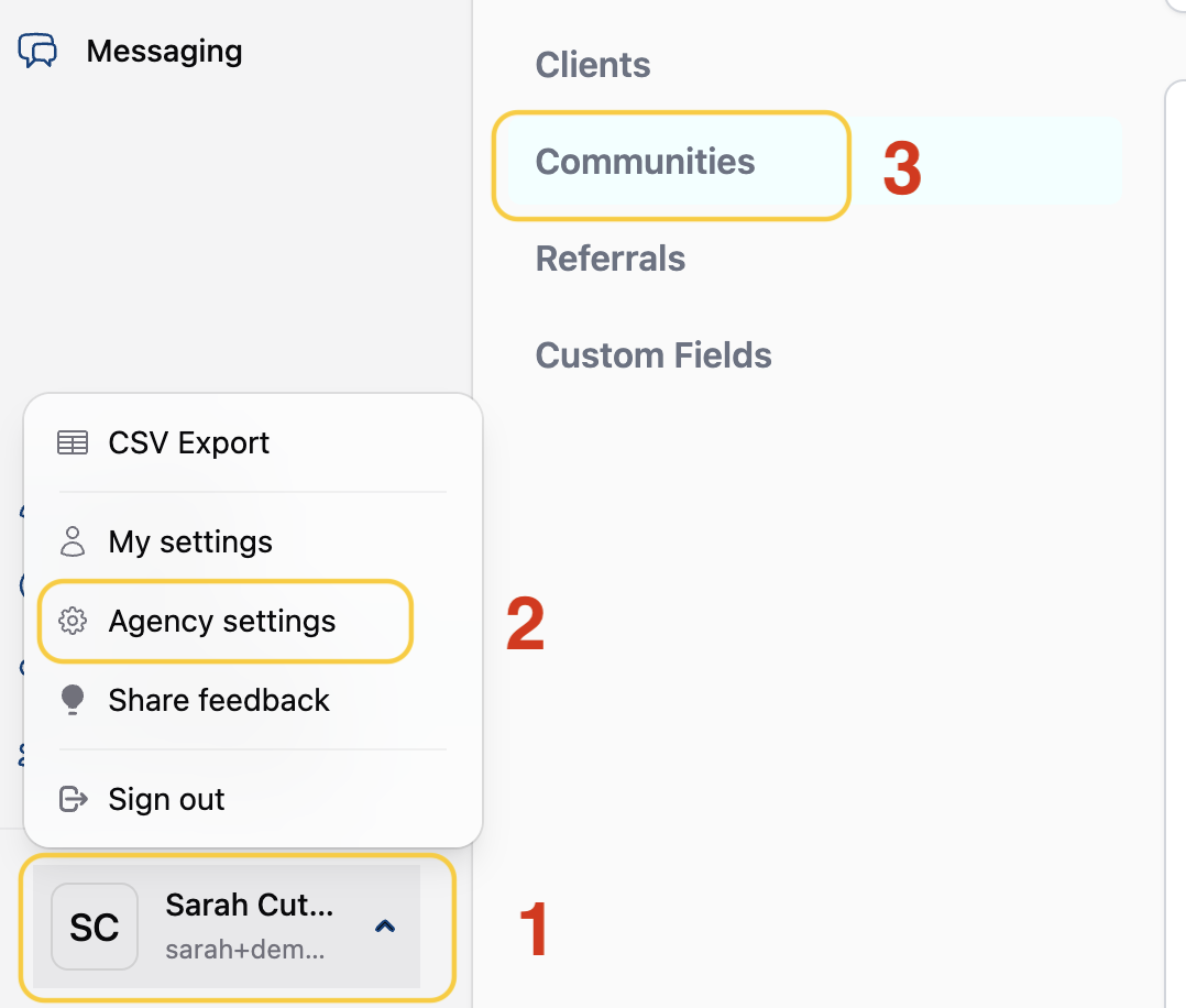 1) Navigate to Agency Settings > Communities